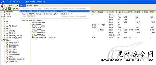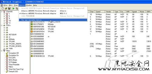 為了能夠最大限度的掃描到當前環境周邊的無線網絡,我們可以通過netstumbler的device菜單下的use any suitable device選項來查看。