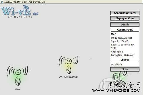首先登錄到DD-WRT管理界面中,然后找到“無線管理”下的“wi-viz”按鈕,開啟“wi-viz”無線掃描工具。開啟后我們會看到“wi-viz”會自動掃描當前DD-WRT無線路由器周圍的無線網絡,如果能夠找到無線網絡的SSID信息就會直接顯示出來,例如本例中的softer,如果對方隱藏了SSID信息那么會直接顯示無線路由器的MAC地址,例如本例中的00:19:e0:cc:95:be。