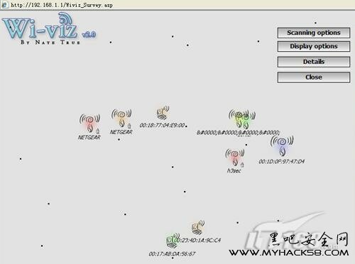 利用“wi-viz”我們不光可以掃描到周邊環境中存在的無線路由器,無線網絡,包括無線客戶端也可以順利掃描到。總之凡是發現找到某個無線網絡但是名稱為MAC地址形式的,他就應該是隱藏了SSID廣播的無線網絡。