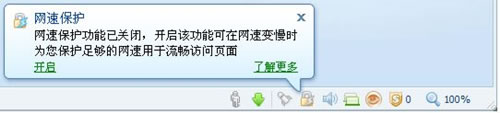 開啟該應用方法很簡單,首先打開搜狗瀏覽器,單擊右下方“網速保護”圖標,然后在彈出的小氣泡窗口中點擊“開啟”按鈕(注意:開啟“網速保護”功能,也許會遭到系統中某些安全軟件的阻攔,請允許放行)。