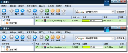 迅雷全速下載時(上)影響網頁打開,啟用網速保護后打開網頁時迅雷下載速度暫時自動調低(下),網頁打開完成又會自動調回全速,無需我們手工設置。