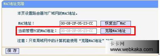 要實現MAC地址克隆功能很簡單,只需在被綁定的那臺電腦上,進入寬帶路由器、無線路由器的WEB設置頁面,找到“WAN”或“CloneMAC”選項,選擇“CloneMAC(MAC地址克隆)”,便可將當前計算機的網卡的MAC地址克隆到路由器的廣域網(WAN)端口。保存后重新啟動寬帶路由器、無線路由器即可正常的多機共享上網沖浪了。
