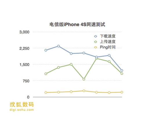 首先是一組北京昌平區回龍觀地區室內測試數據,聯通iPhone 4S下載速率最高為4.9Mbps,最低3.9Mbps;上傳最快是0.55Mbps,最低0.47Mbps。電信iPhone 4S下載速率最高為2.3Mbps,最低1.2Mbps、上傳速率最快為1.7Mbps,最低0.8Mbps。