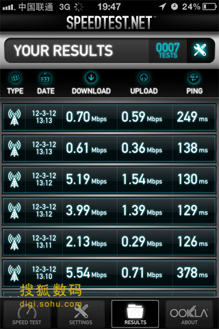 對比聯通和電信iPhone 4S在北京的3G網絡使用情況,首先這兩張3G網絡作為手機瀏覽已經夠用,如果不是特別強調網速,兩者差別不大。二者的優劣在于,電信EV-DO的網絡比較穩定,可能于相對用戶偏少有關,缺點是下行網速比較慢,但上傳不錯。聯通WCDMA網絡的優勢在于下載網絡很快,信號好的地方5Mbps以上沒有問題,缺點是網絡波動明顯,同時上行速度偏慢。