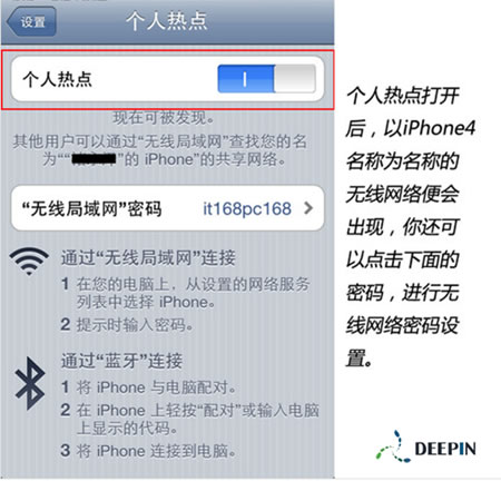 三、個人熱點打開后,以iPhone4名稱為名稱的無線網絡便會出現,你可以點擊下面的密碼,進行無線網絡密碼設置,以防別人蹭網。