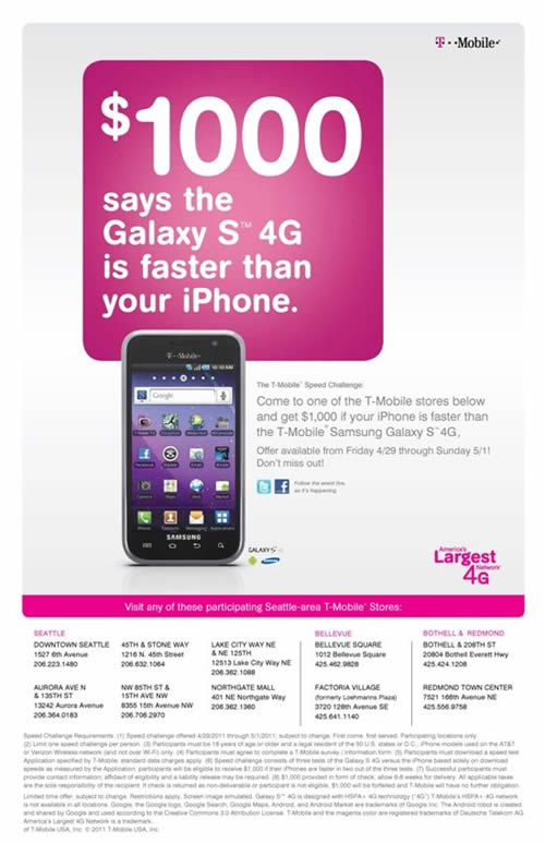 T-Mobile乘熱打鐵,宣布將于本周末舉行一場競賽,如果哪位iPhone用戶的下載速度能夠超過三星Galaxy S 4G,就將為其提供1000美元的獎(jiǎng)金。