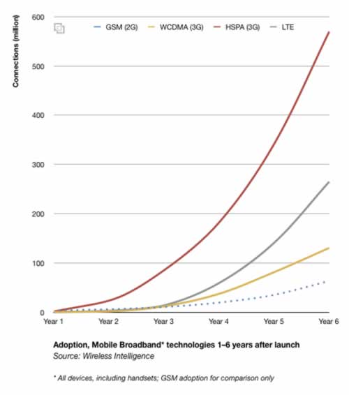 90年代中期,GSM問世,和GSM前六年的發(fā)展相比,WCDMA HSPA的普及率為GSM的6-10倍。現(xiàn)在每月增加的HSPA連接達1900萬,到2012年底總量會達到10億。到2015年,LTE連接會達到3億。
