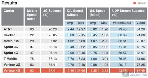 測試報告顯示美國Verizon的LTE 4G網絡速度綜合表現極佳,綜合表現Verizon LTE 4G網絡勝出,但是在個別地區中AT&T表現也不錯。