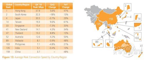 首先來看看中國香港特別行政區。據全球最大的內容傳送網絡商Akamai發布的2010年第四季度互聯網發展報告顯示,中國香港的平均網速為9.4Mbps(8Mbps=1MB/s)列全球第二,僅次于韓國;平均最高網速則為37.9Mbps,居全球首位。