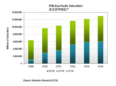 研究也發現雖然中國的FTTx 家庭普及率還非常低,FTTH/B用戶數已經很接近日本2010年的用戶數,有將近2000萬個用戶。它將會引領此區域未來實質的大幅增長。