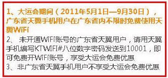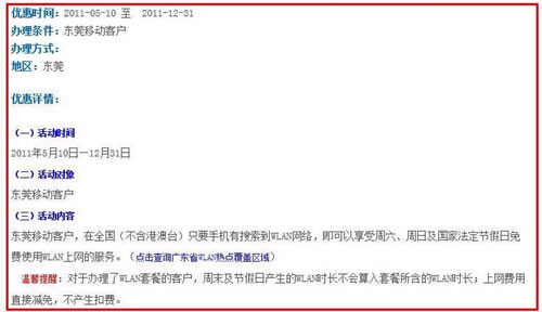 而我所在的東莞移動2011年5月10日—12月31日在全國(不含港澳臺)只要手機有搜索到WLAN網絡,即可以享受周六、周日及國家法定節假日免費使用WLAN上網的服務。