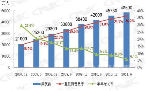 截至2011年6月底,我國網民總數達到4.85億,2011年上半年網民增長率為6.1%,是近年來最低水平。新增網民為2770萬,網民增長的絕對數量也小于去年同期(2010年上半年)3600萬的水平。網民規模增長放緩,是由于互聯網應用普及缺乏新的促進因素。2009年3G手機上網帶動了網民增長的新浪潮,隨著技術與應用能量的逐步釋放,易轉化群體逐漸被滲透和納入網民群體,目前非網民群體互聯網滲透的難度加大。報告同時稱,在8.15億非網民中,“不懂電腦/網絡”是其不上網的重要原因,而且這一因素的影響力度還在加大。