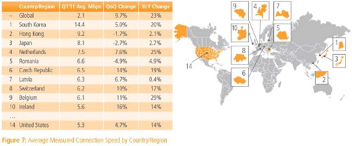 互聯網統計機構Akamai周一發布2010年互聯網狀況報告,報告顯示三分之二美國網民的網速低于5 Mbps,遠遠落后于韓國和日本。