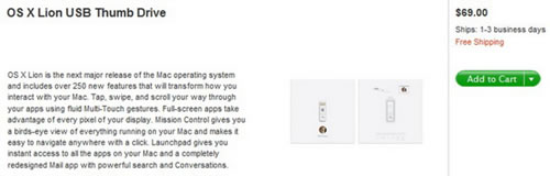 今天,Lion安裝U盤正式上架蘋果在線商店,面向全球Mac用戶發售,售價為69美元,免費配送,配送時間為1-3個工作日。需要提醒大家的是,一旦采用U盤安裝Lion,以后也只能通過U盤來恢復系統,而不能使用Lion自帶的聯網恢復(Recovery)功能。