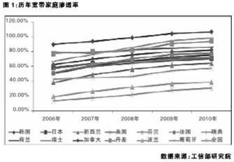 近幾年寬帶家庭滲透率逐年提高,圖1顯示了世界主要國家的寬帶家庭滲透率。可以看出,日韓等國家的寬帶滲透率遠遠高于世界其他國家,圖中全國寬帶普及率為我國的普及率,還處在較低的水平。