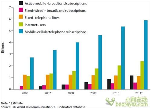 ITU數據顯示,2010年底全球網民數量為20.8億,而一年前為18.6億。手機用戶數量為52.8億,而2009年底時為46.6億。