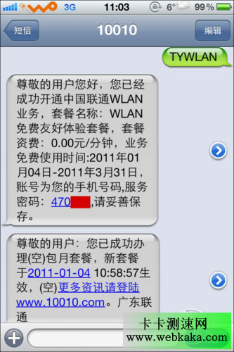 中國聯通后付費手機用戶請發送短信“TYWLAN”至10010申請參加WLAN免費體驗活動,受理成功后您將收到初始登錄密碼,您的賬戶有效期至2011年3月31日。