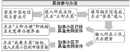 用戶只需上網上營業(yè)廳進行簡單的登記,若用戶所在的小區(qū)被“點亮”超過50次,該小區(qū)即可在50個工作日內升級為光小區(qū)。