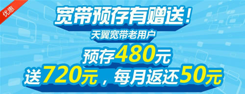 今天接到電信客服的電話,告知現在電信推出“寬帶預付480元送720元”的優惠活動,此項活動僅限使用電信寬帶多年的老用戶享受。