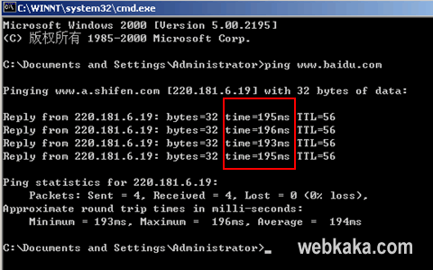 注意到紅色部分,如果顯示大于100ms,那說明你的網速是很慢的了,baidu的ping值一般不能超過50ms。