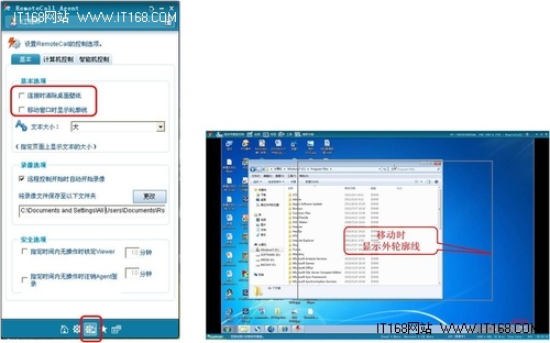 登錄RemoteCall之后,可以看見主面板下方有5個圖標按鈕,點擊“遠程支持環境設置”圖標按鈕(即第3個)。在新打開的面板中,可以看見有“基本”、“計算機控制”、“智能機控制”三個選項卡。在“基本”選項卡中,勾選“連接時清除桌面壁紙”和“移動窗口時顯示輪廓線”選項有助于提高遠程連接與控制的速度。因為遠程連接時保留使用色彩鮮艷、元素繁多的個性化壁紙會增加初次連接時的數據傳輸量,所以勾選“連接時清除桌面壁紙”選項,遠程連接時按系統默認的原始桌面顯示(純藍色的元素單一的桌面)能提高遠程連接速度。“移動窗口時顯示輪廓線”即遠程控制過程中,移動窗口時不顯示窗口中的內容,只顯示外輪廓線(如上右圖所示),移動結束后再顯示其內容,這樣也可以提高遠程控制的速度。