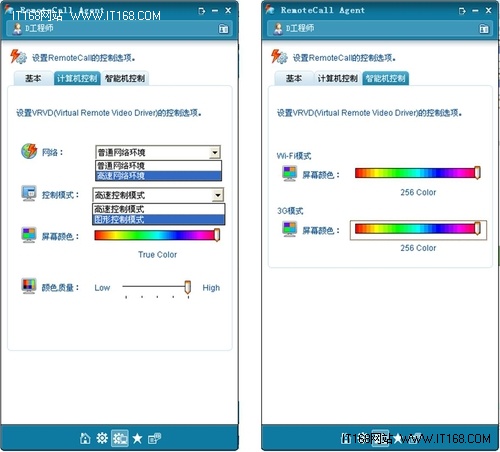“智能機控制”選項卡是專門針對遠程控制智能手機時的設置。在這里可設置Wi-Fi和3G網絡環境下的屏幕顏色為4色、16色、64色、256色。4色時控制速度最快,256色畫質最好速度較快。