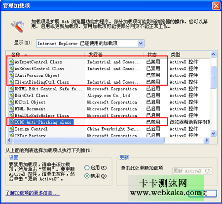 我于是把幾個工行的ActiveX控件統統禁用掉。
