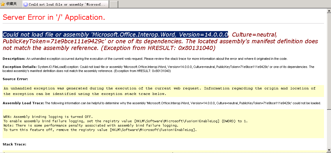 Exception Details: System.IO.FileLoadException: Could not load file or assembly 'Microsoft.Office.Interop.Word, Version=14.0.0.0, Culture=neutral, PublicKeyToken=71e9bce111e9429c' or one of its dependencies. The located assembly's manifest definition does not match the assembly reference. (Exception from HRESULT: 0x80131040)