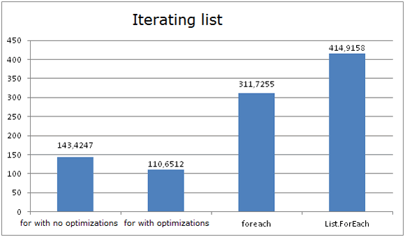 該圖顯示 FOR 和 FOREACH 在遍歷數(shù)組時花費相同的時間。也是因為CLR優(yōu)化將FOREACH轉(zhuǎn)換為FOR,并以數(shù)組的長度作為最大迭代邊界。不管數(shù)組長度是否緩存(使用FOR時),結(jié)果都差不多。