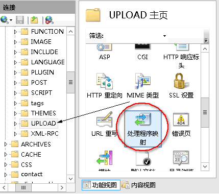 點擊選中要設(shè)置的目錄,例如UPLOAD,然后雙擊“處理程序映射”圖標(biāo)。