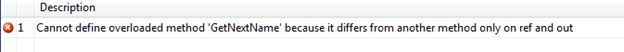 ref 和 out 在運行時的處理方式不同,而在編譯時它們的處理方式相同,因此如果一個方法將參數作為 ref 而另一個將參數作為 out,則不能重載方法。
