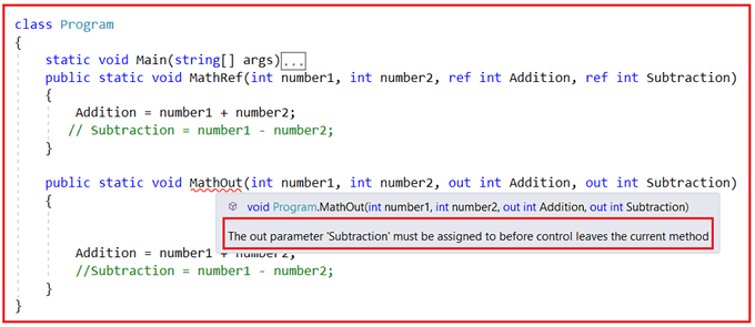 當我們調用帶有“out”變量的函數時,必須更新函數內部的 out 變量。但如果你使用 ref 變量,這不是強制性的。例如,請看下面的代碼。在這里,我們正在評論第二個更新語句。作為參考,我們沒有收到任何編譯時錯誤。但是對于 out,我們會收到一個編譯時錯誤,提示“在控制離開當前方法之前必須將 out 參數‘Subtraction’分配給”,如下所示。