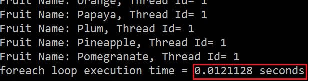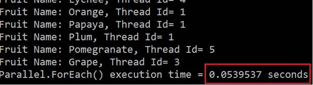 Console.WriteLine("Fruit Name: {0}, Thread Id= {1}", fruit, Thread.CurrentThread.ManagedThreadId);