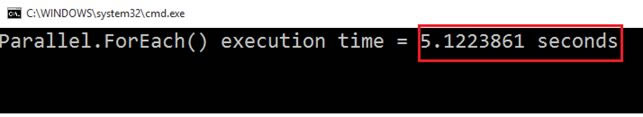 Console.WriteLine("Parallel.ForEach() execution time = {0} seconds", stopWatch.Elapsed.TotalSeconds);