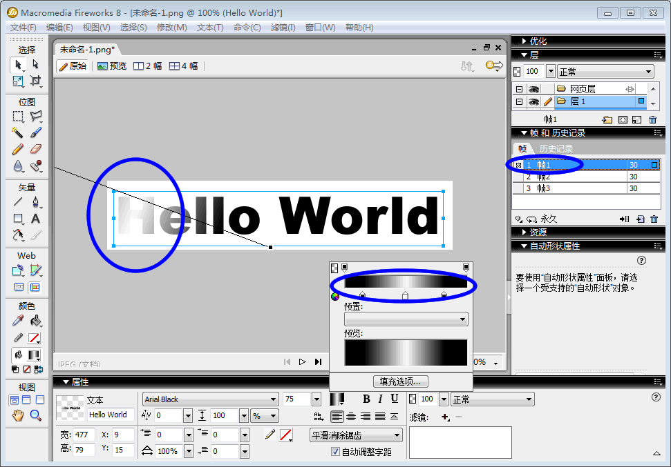 把下面圖片所示的漸變填充指示桿向右拖移,讓文字光亮部分向右移動。