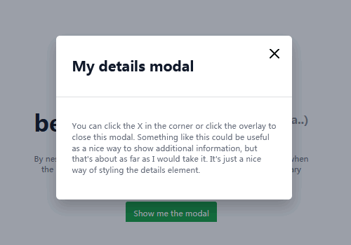 單擊“詳細信息”時會打開模式窗口。用戶通過單擊模式窗口的“X'”或外部來關閉窗口。