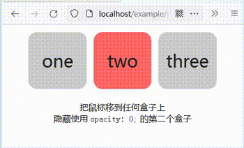 <p>把鼠標移到任何盒子上<br>隱藏使用 <code>opacity: 0;</code> 的第二個盒子</p>