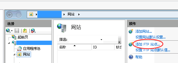 4、打開IIS管理器,點擊左側“網站”,點擊右側“添加FTP站點”。