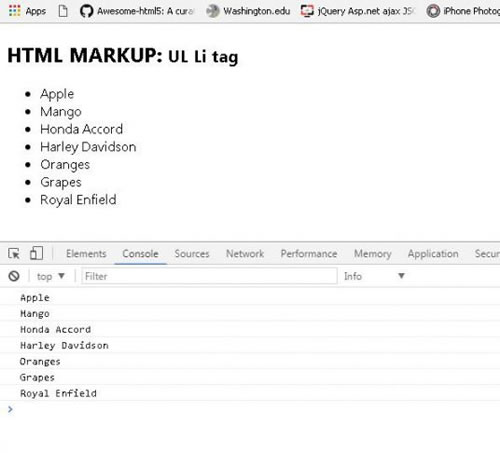 這個例子中將循環遍歷HTML元素即是li標簽并顯示li標簽的文本。 我們的HTML標記ul,li標簽如下。