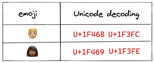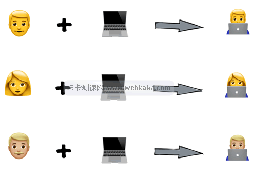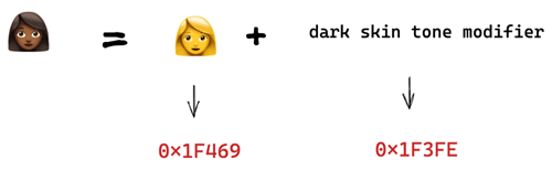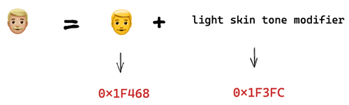 同時,我們也知道 Unicode 碼位是有限的,我們不可能為所有的 emoji 分配一個獨立的 Unicode 編碼。所以一些表情符號是由基本的表情符號加上表情符號修飾符組成的,例如: