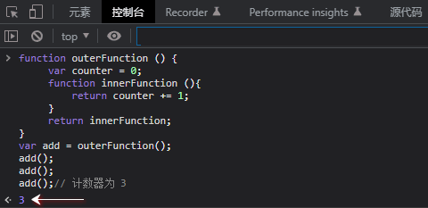 這時候的add就形成了一個閉包。一個閉包由兩部分組成,函數(shù)和創(chuàng)建該函數(shù)的環(huán)境。環(huán)境是由環(huán)境中的局部變量組成的。對于閉包add來說,它由函數(shù)innerFunction和變量counter組成,所以這時候add是可以訪問變量counter的。