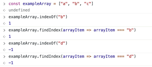 exampleArray.findIndex(arrayItem => arrayItem === "d") // -1