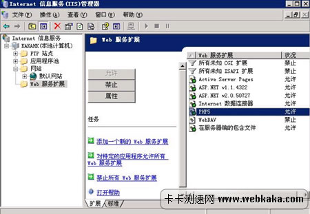 1)、選擇開始菜單->程序->管理工具-> Internet 信息服務(IIS)管理器,然后點擊“Web服務擴展”,看看php擴展是否允許運行了。如果沒有,如何沒有運行,則運行它即可。