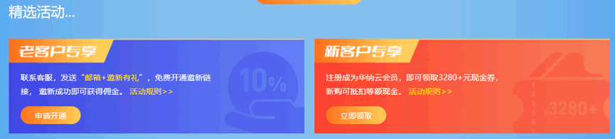 華納云老用戶可參與邀新有禮活動(dòng),咨詢官網(wǎng)在線客服免費(fèi)開通邀新鏈接,邀新成功即可獲得10%傭金。另本次活動(dòng)期間華納云首次注冊(cè)的用戶,即可領(lǐng)取3280的現(xiàn)金抵扣券,新購(gòu)華納云香港云服務(wù)器、香港服務(wù)器、香港高防服務(wù)器、香港高防IP,DNS污染處理,美國(guó)云服務(wù)器,美國(guó)物理服務(wù)器,美國(guó)高防服務(wù)器等多款產(chǎn)品均可使用。